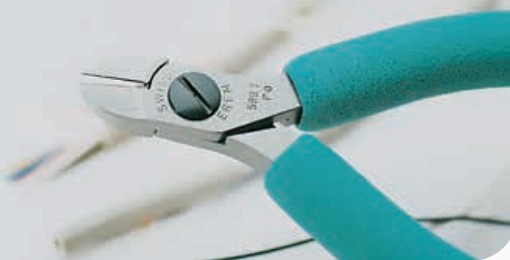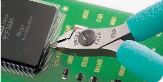 用于醫療設備制造的斜口剪鉗 632NCF微型斜口剪鉗是醫療設備應用中的硅膠管、精密接頭密封件或 微型橡膠密封件等軟材料的理想之選。 這款微型剪鉗也是在助聽(tīng)器制造等應用中切割軟合成材料件的理想工 具。 632NCF斜口剪鉗的刀刃被精磨至極高水平。因此,這款剪鉗能夠剪出 與剃刀類(lèi)似的全齊平切 用于拆卸細間距SMD集成電路的尖嘴剪鉗 拆卸SMD集成電路的一種簡(jiǎn)單方法是剪斷每根單獨的引線(xiàn)以拆下器 件,然后使用烙鐵對焊點(diǎn)進(jìn)行回流焊,再將元件引線(xiàn)從電路板上拆下。 使用吸錫槍或者吸錫帶,在安裝新元件前,清除線(xiàn)路板上的殘留焊料。 670EP和670EPF具有細尖錐形和凹形鉗頭,能夠定位到兩條單獨的引 線(xiàn)之間并將其剪斷,而不會(huì )對印刷電路造成損壞。